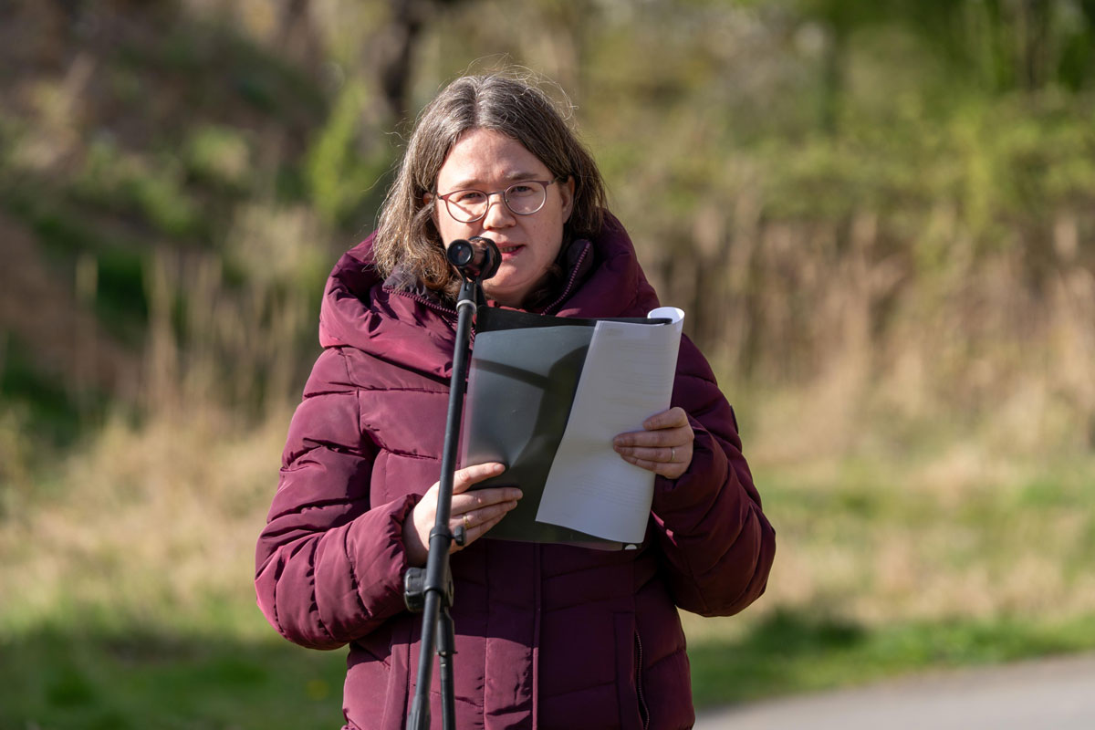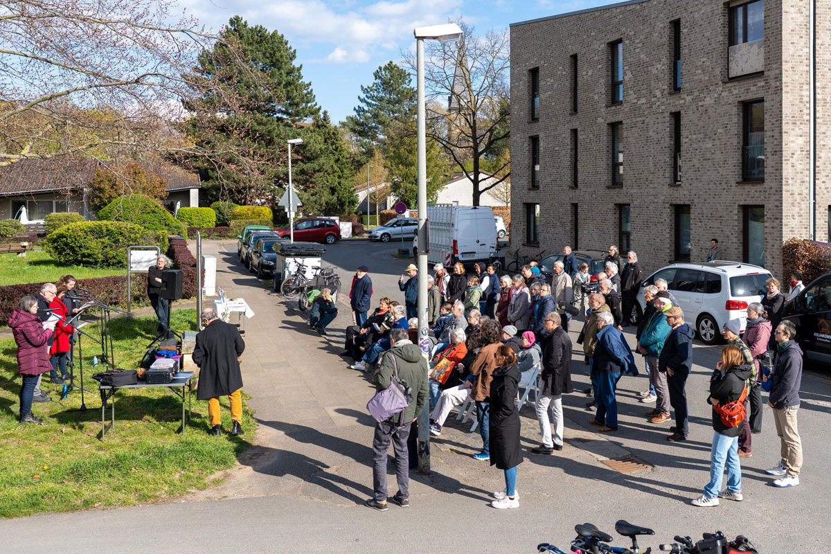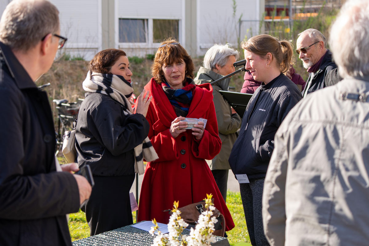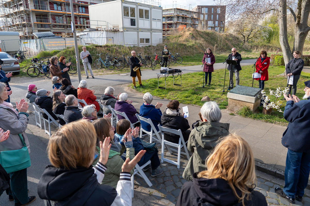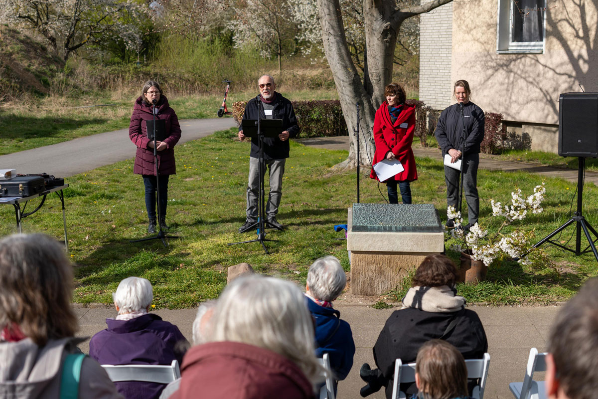 Etwa 60 Menschen erin­ner­ten am 10. April 2026 gemein­sam an die Befrei­ung des KZ-Außenlagers in Limmer vor 81 Jahren und gedach­ten der Frauen, die hier vor allem für die Conti­nen­tal AG Zwangs­arbeit leis­ten muss­ten.